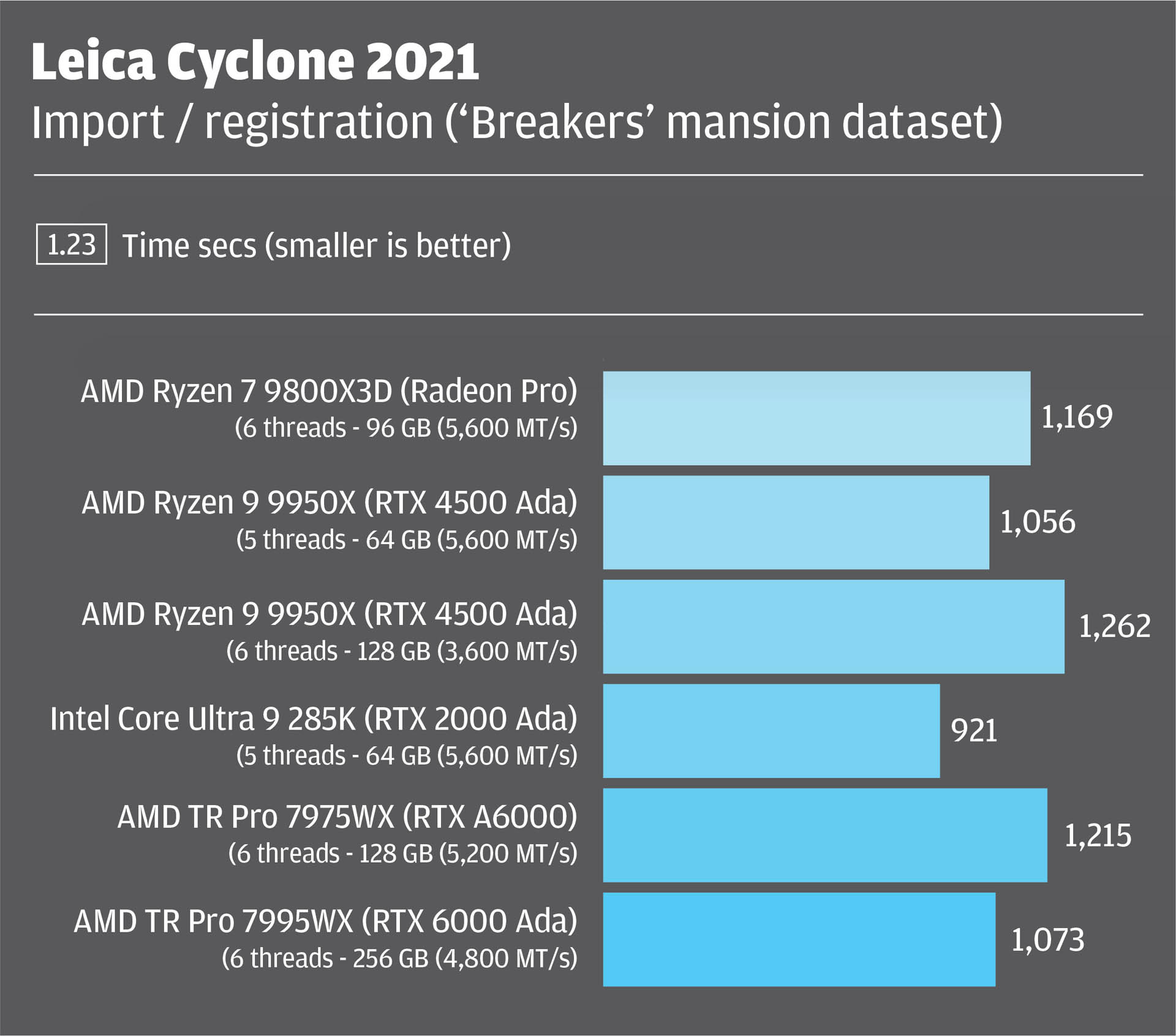 Processing reality capture data can take hours, making it essential to select the right workstation hardware. In this article, we explore the best processor, memory and GPU options for reality modelling, testing a variety of workflows in three of the most popular tools — Leica Cyclone 3DR, Leica Cyclone Register 360, and RealityCapture by Capturing Reality, a subsidiary of Epic Games.