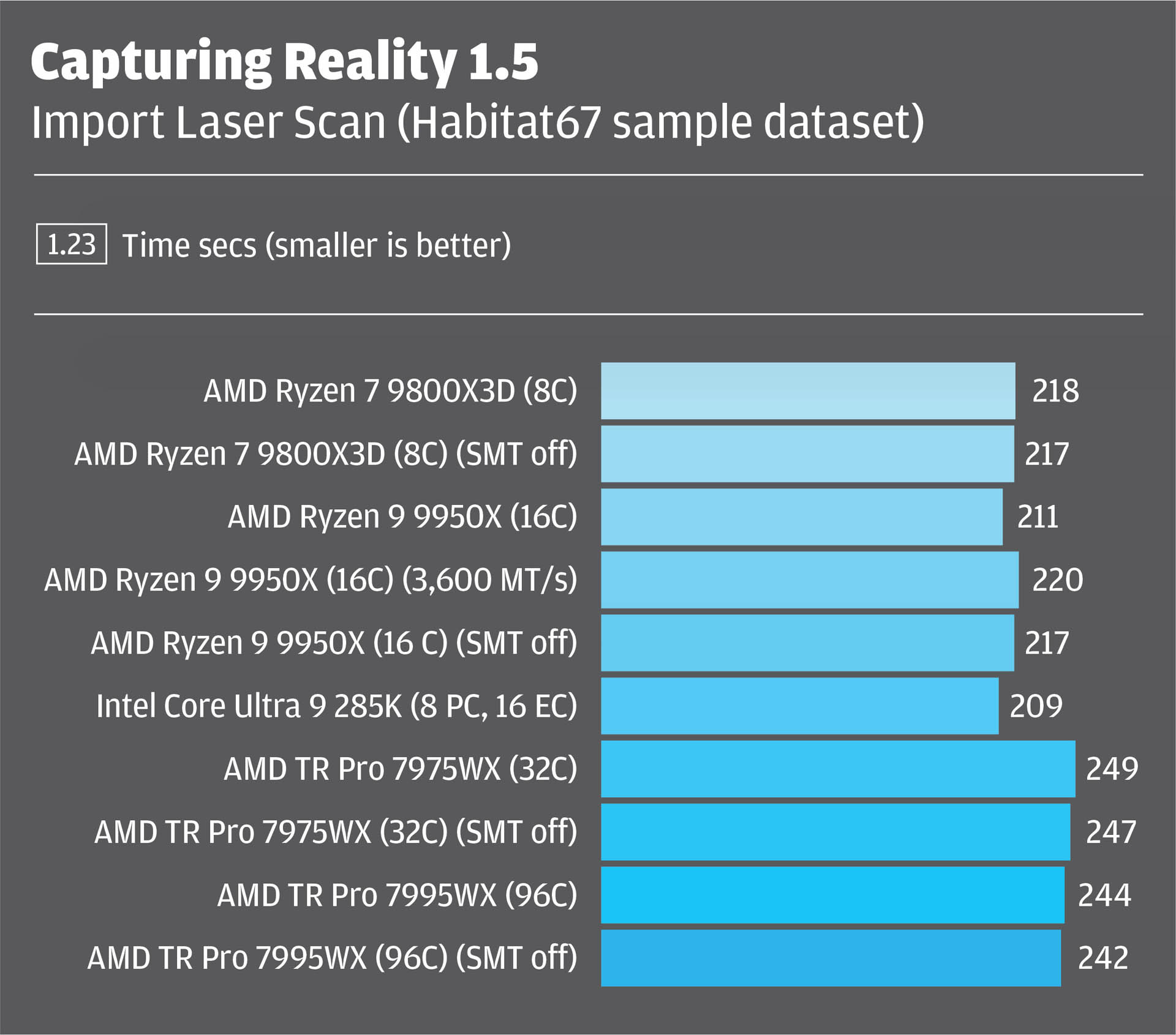 The process is multi-threaded, but certain stages only use a few cores. As with scan-to-mesh, more CPU cores does not necessarily mean faster results, and CPU cache, SMT and memory speed also play an important role. Again, the AMD Ryzen 7 9800X3D bagged first spot, completing the test 16% faster than its closest rival, the Intel Core Ultra 9 285K.